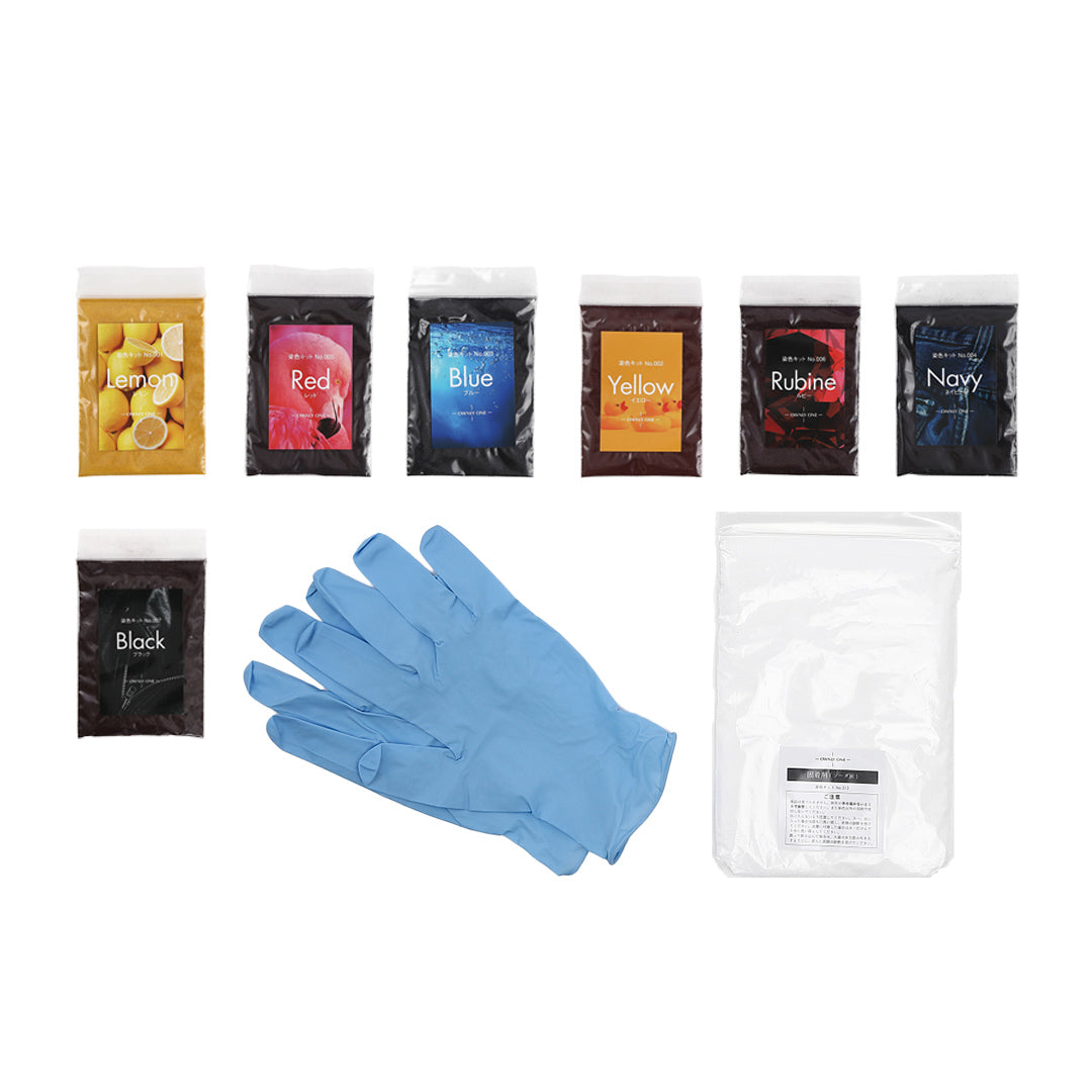 [カラー染料(Lemon・Yellow・Red・Rubine・Blue・Navy)+Black染料+固着剤+ゴム手袋]