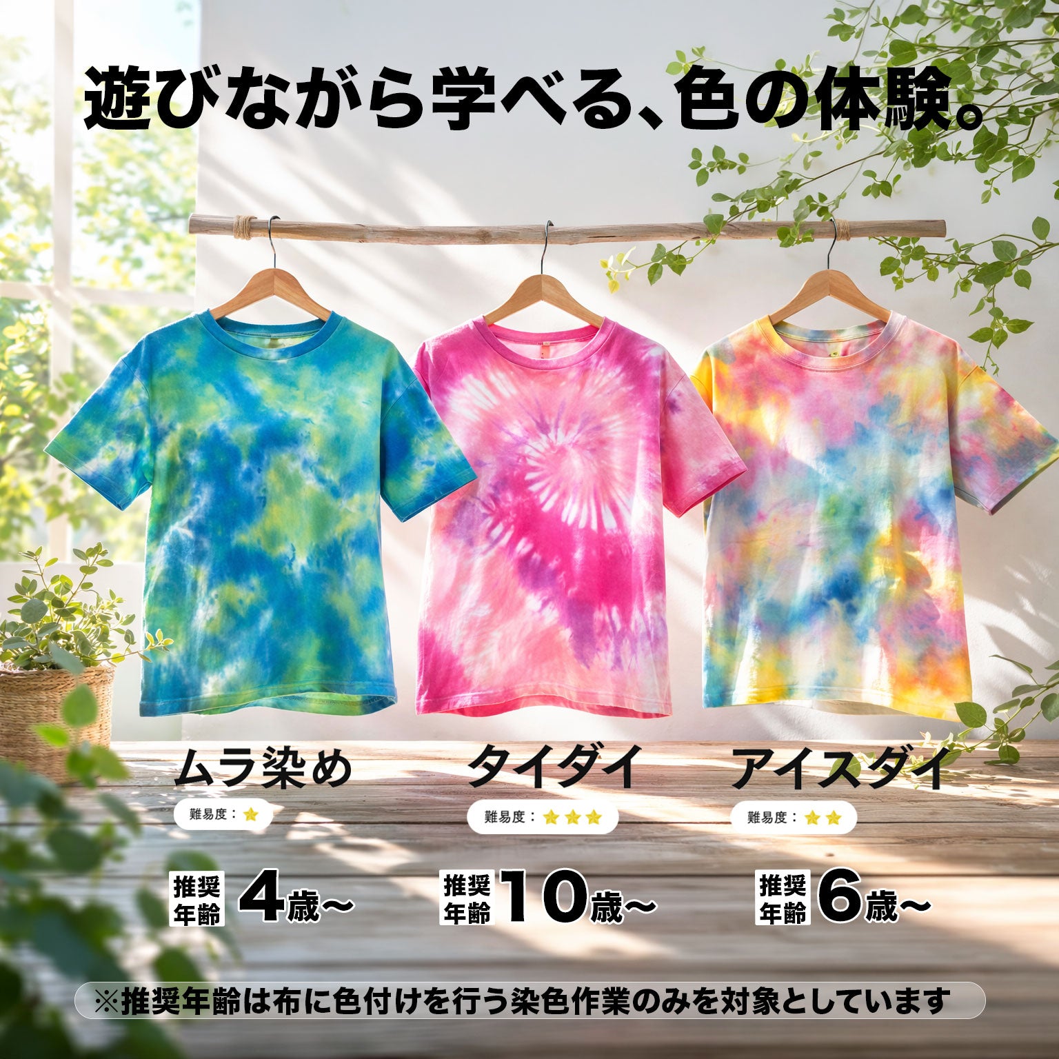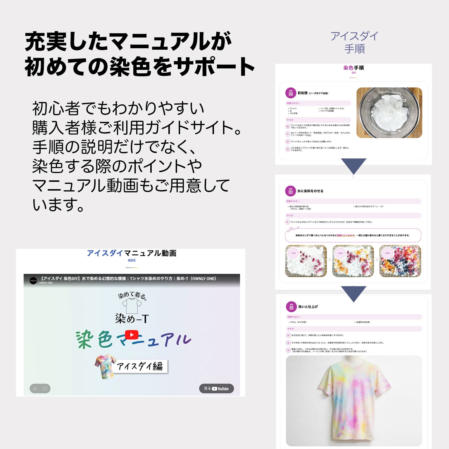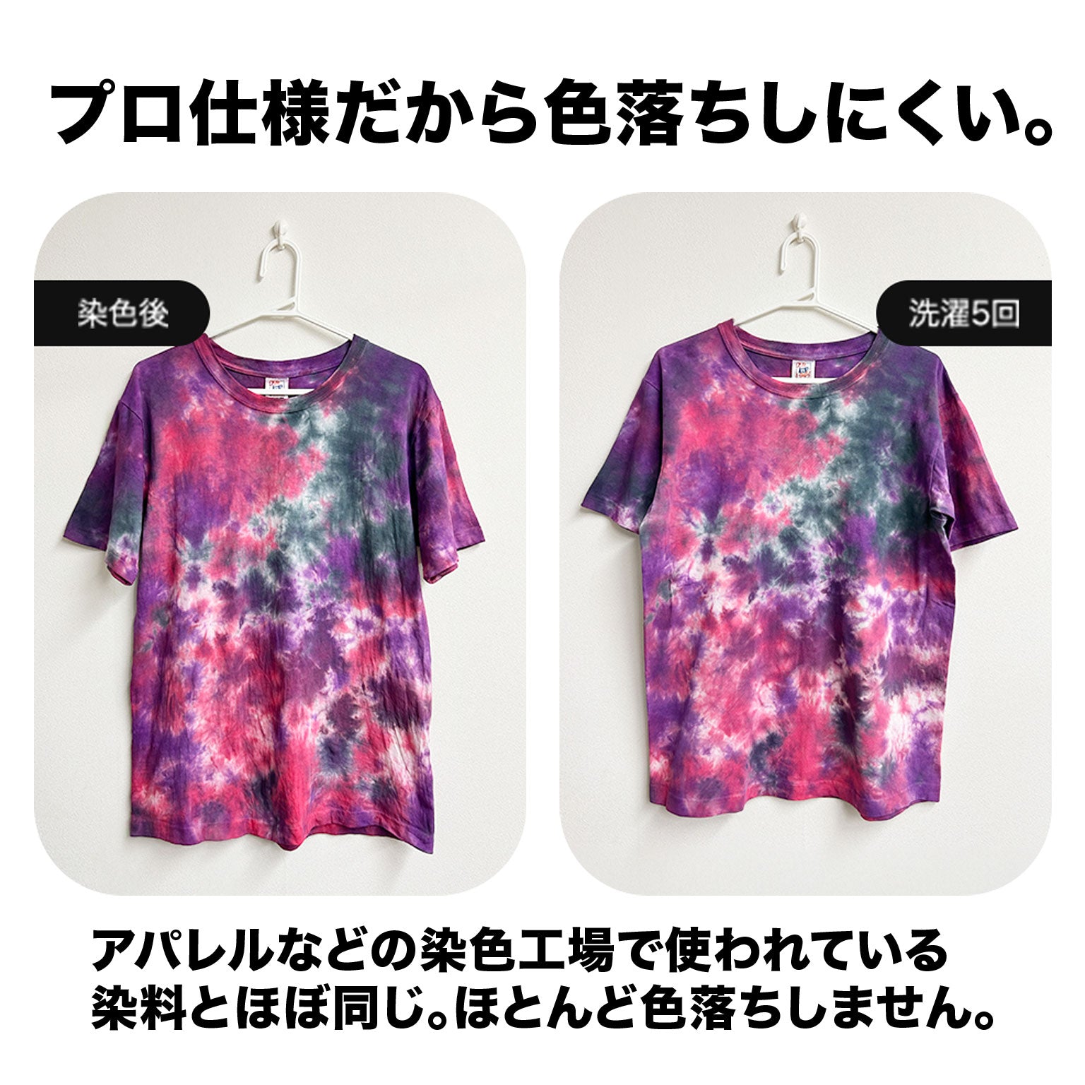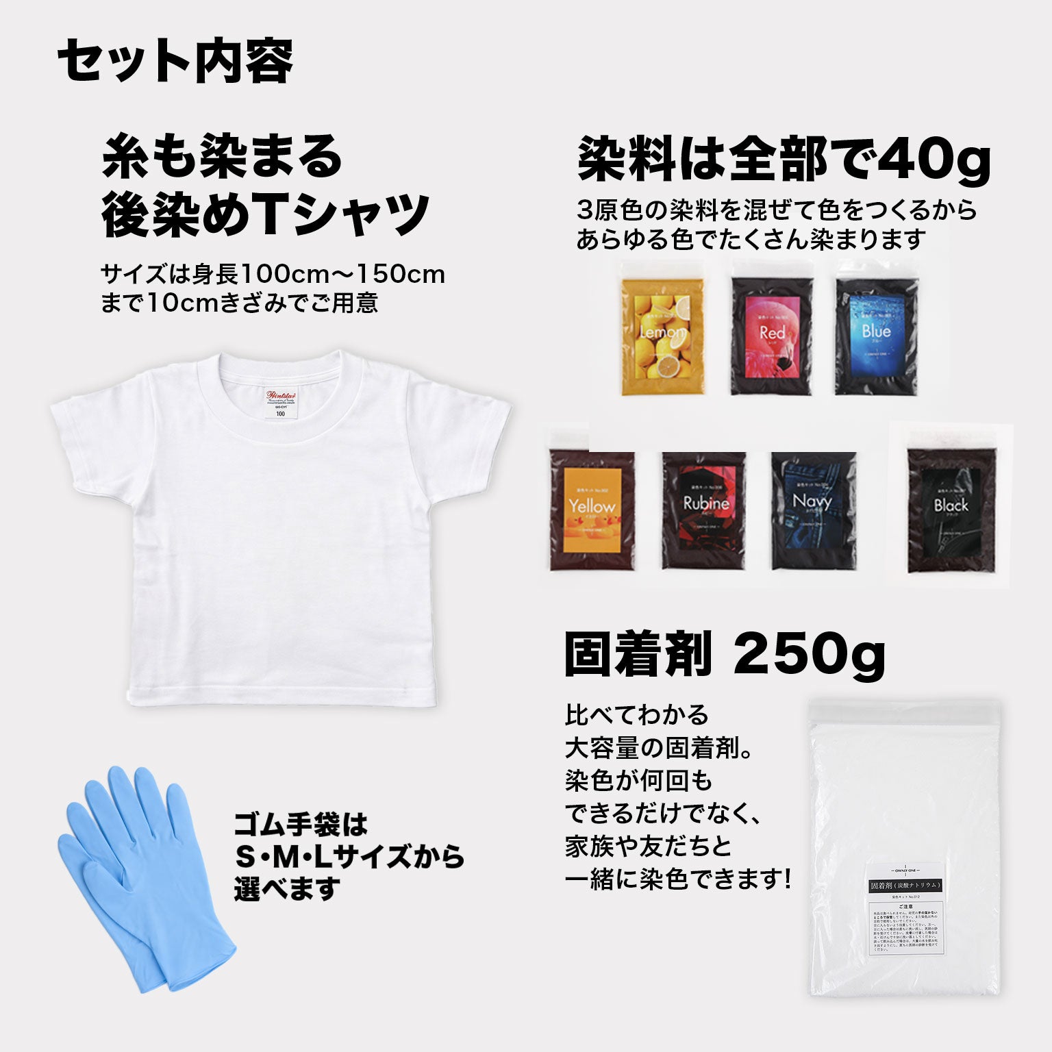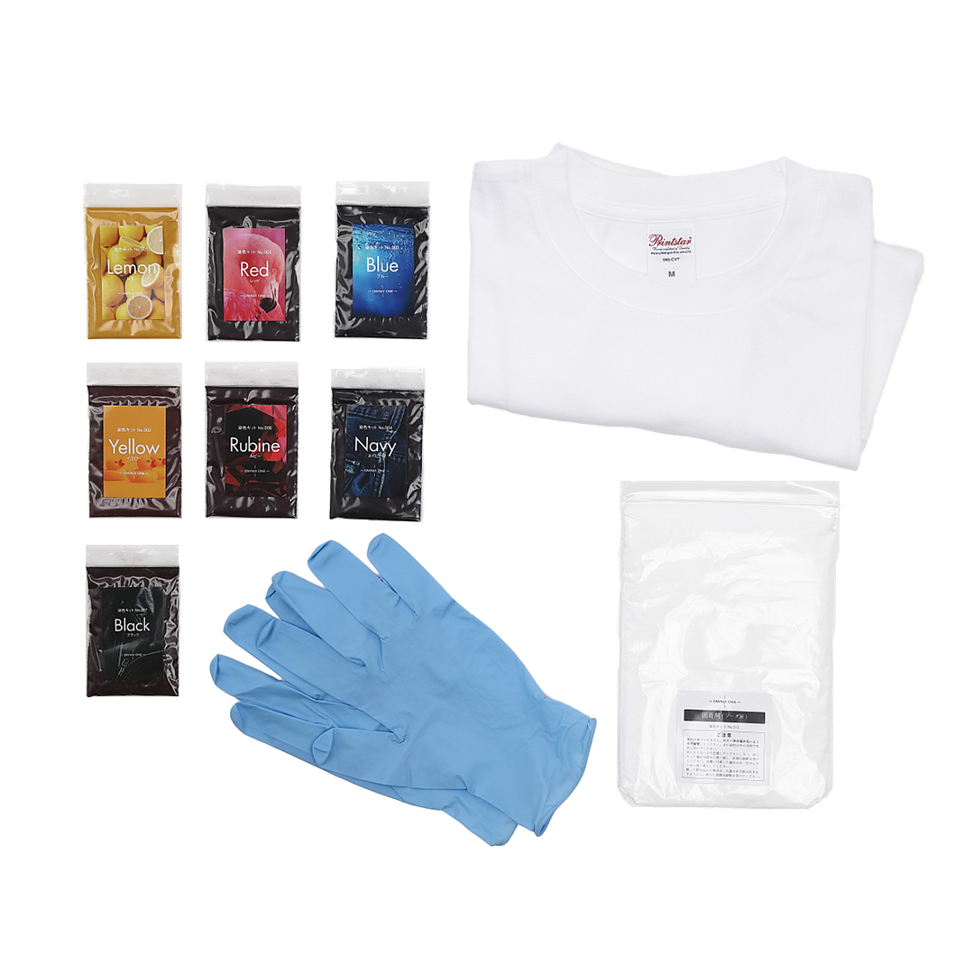 [Tシャツ(いずれか1点)+カラー染料(Lemon・Yellow・Red・Rubine・Blue・Navy)+Black染料+固着剤+ゴム手袋]